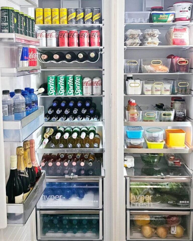 Beverages are the ultimate space hogs. If your sparkling water is currently taking up half a shelf, you need layered drink shelves. These stack your cans or bottles vertically so you aren’t playing “bottle dominoes” every time you want a soda. It’s a total game-changer for small fridges. 🙂