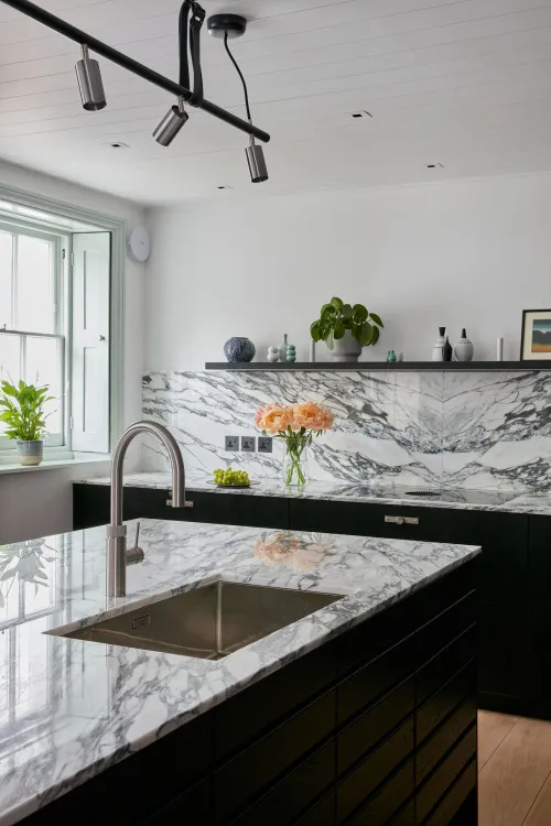 Look for materials that have movement. A static, solid white counter can look stark and cheap next to rich black paint. You want depth.