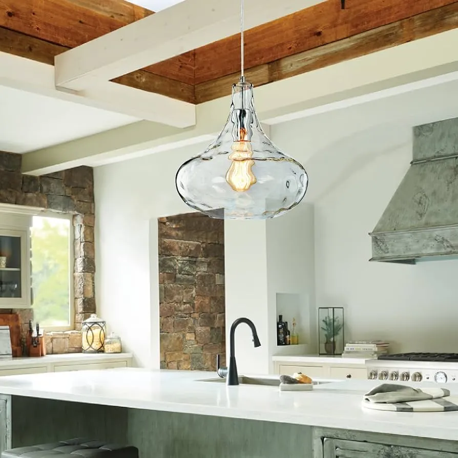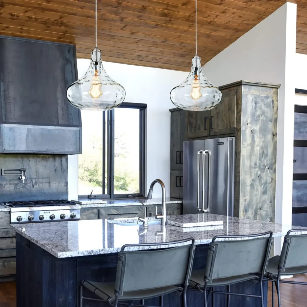 Hammered glass has a beautifully rustic and artisanal quality. The dimpled texture is created by hammering the glass when it’s still hot, so each piece has a unique, handcrafted pattern. This texture does a wonderful job of diffusing the light, creating a shimmering, water-like effect on surrounding surfaces. The unique hammered Glass Pendant Lights Over Kitchen Island add a touch of organic texture and character.
