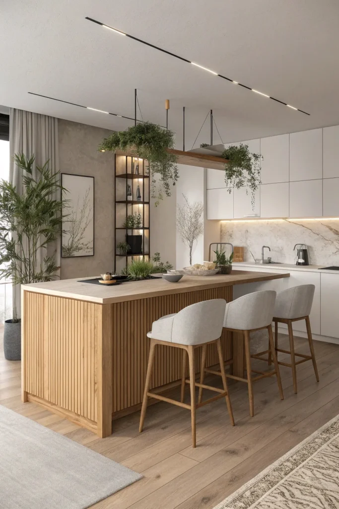 An island with clean edges in light wood or stone complements this aesthetic beautifully.