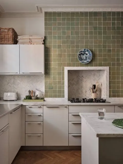 Green is having a massive moment in kitchen design. From sage to emerald, it brings the outdoors in. Glass tiles have a translucency that reflects light differently than ceramic.