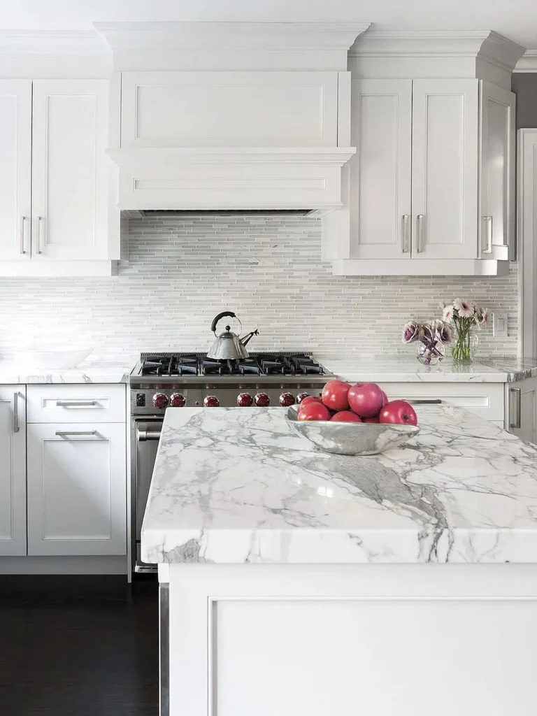 Matching your countertops to your backsplash creates a seamless, ultra-clean look. Carrara or Calacatta marble pairs effortlessly with white cabinets because the gray veining ties everything together. It eliminates grout lines entirely (less scrubbing, yes please!), and it reflects light around the room like a mirror.