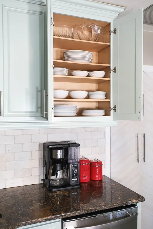 I reserve upper cabinets for lightweight, frequently used items. The cabinet nearest the dishwasher holds everyday dishes, glasses, and mugs for easy unloading. Cabinets above the coffee station contain coffee mugs and supplies.