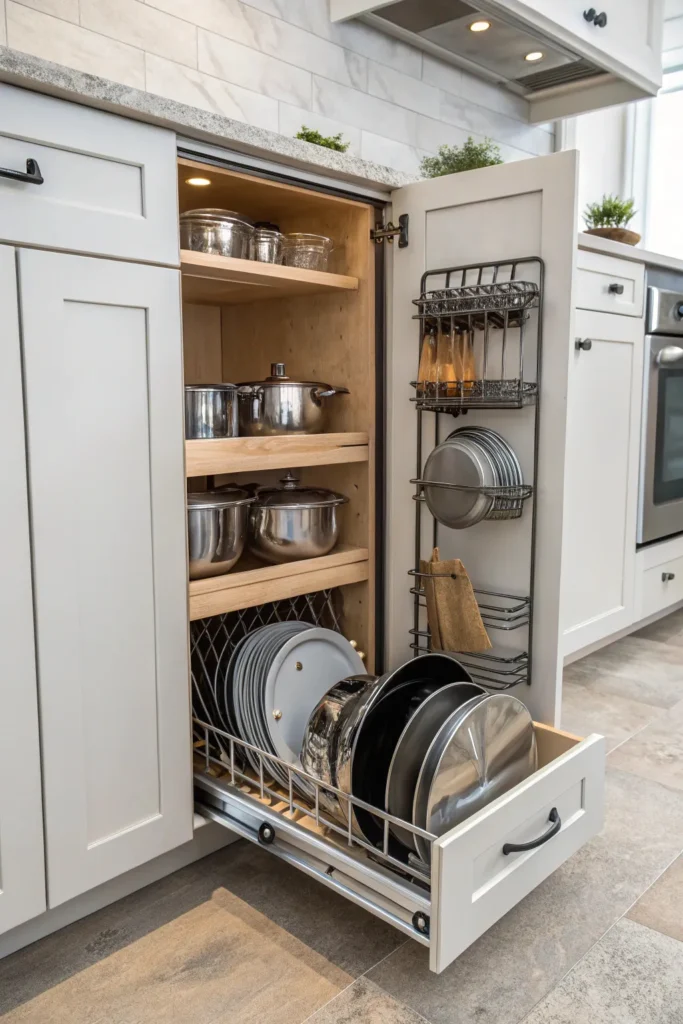 I’ve tried many systems, but the most effective is storing pots and pans in deep drawers with dividers. If drawer space is limited, vertical organizers in cabinets work well too. Always store lids separately—either on a door-mounted rack or in a vertical file organizer.