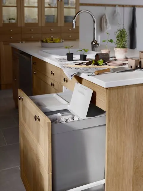 • Pull‑out by sink: trash, recycling, compost in one bay with clear liners and labels.