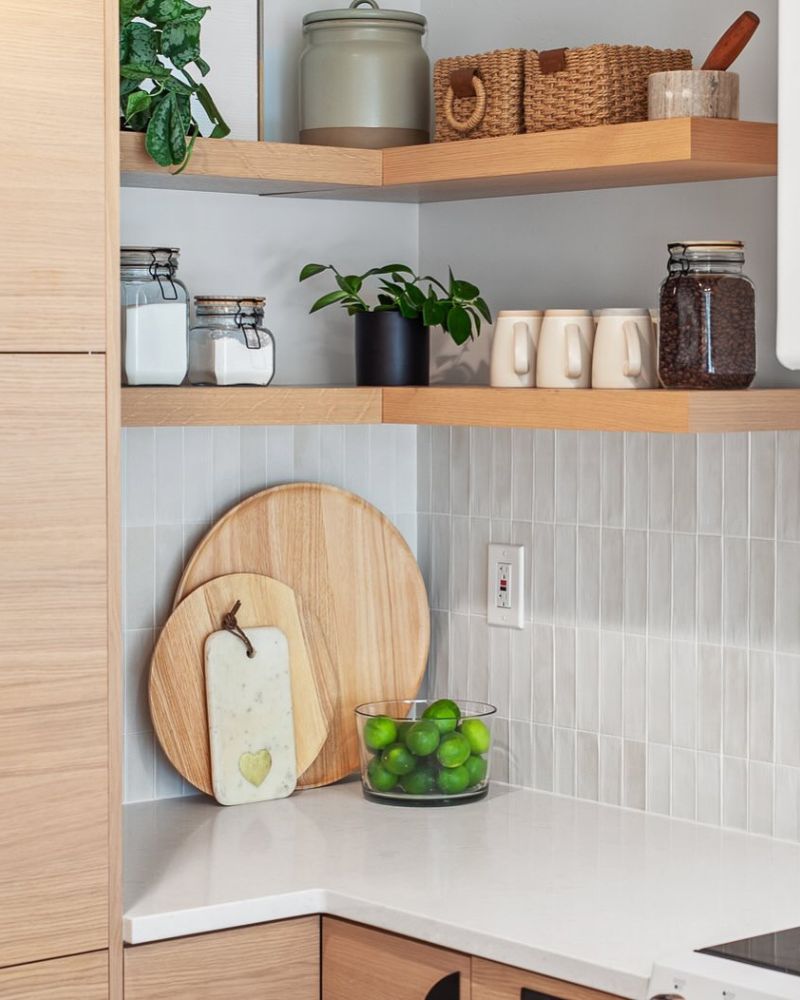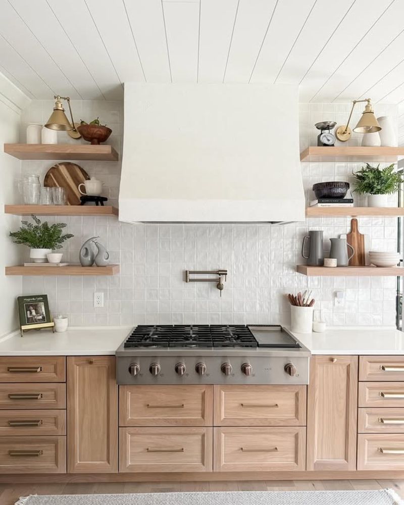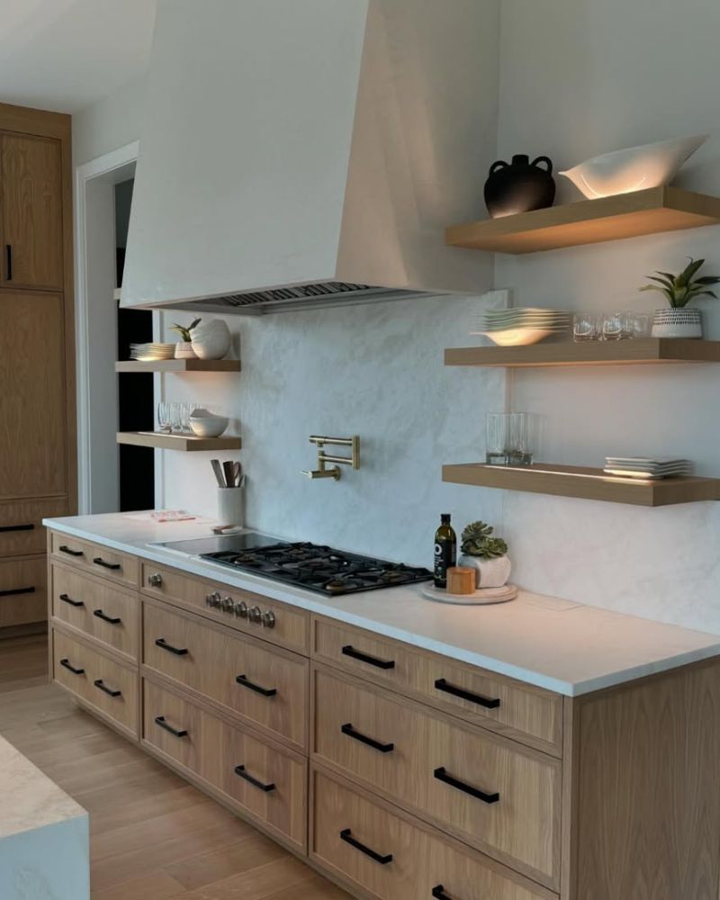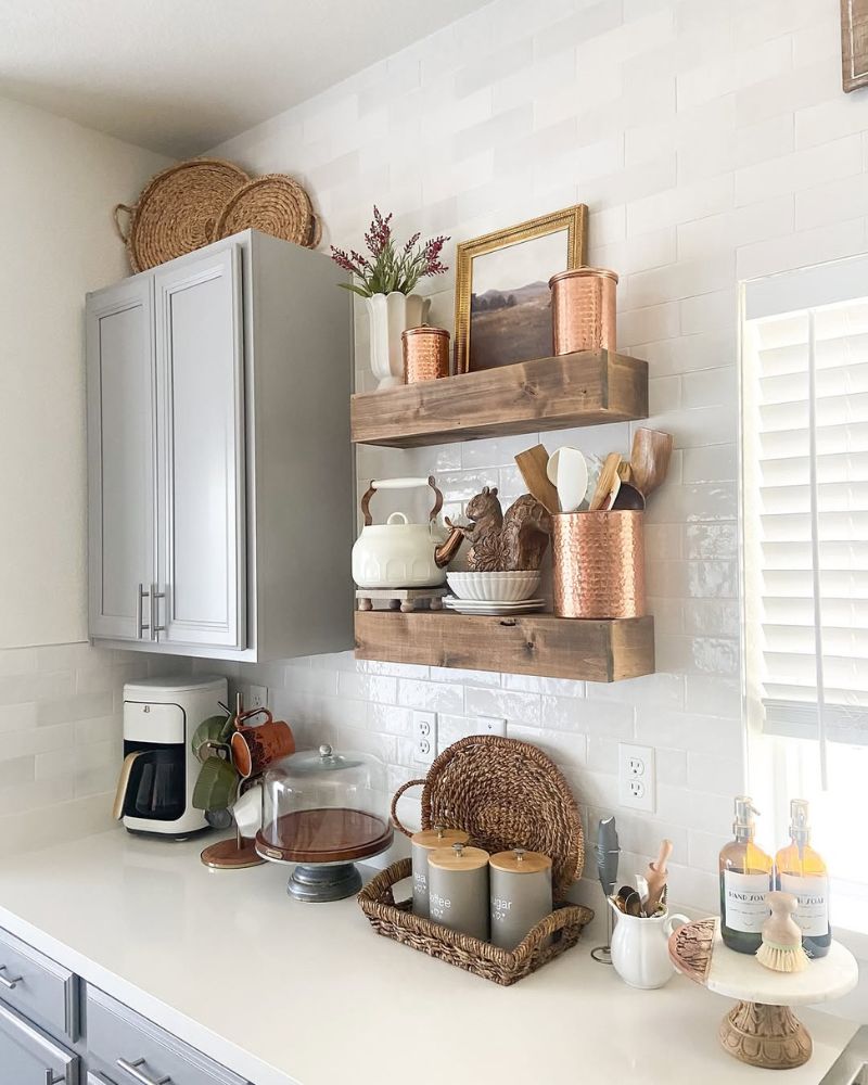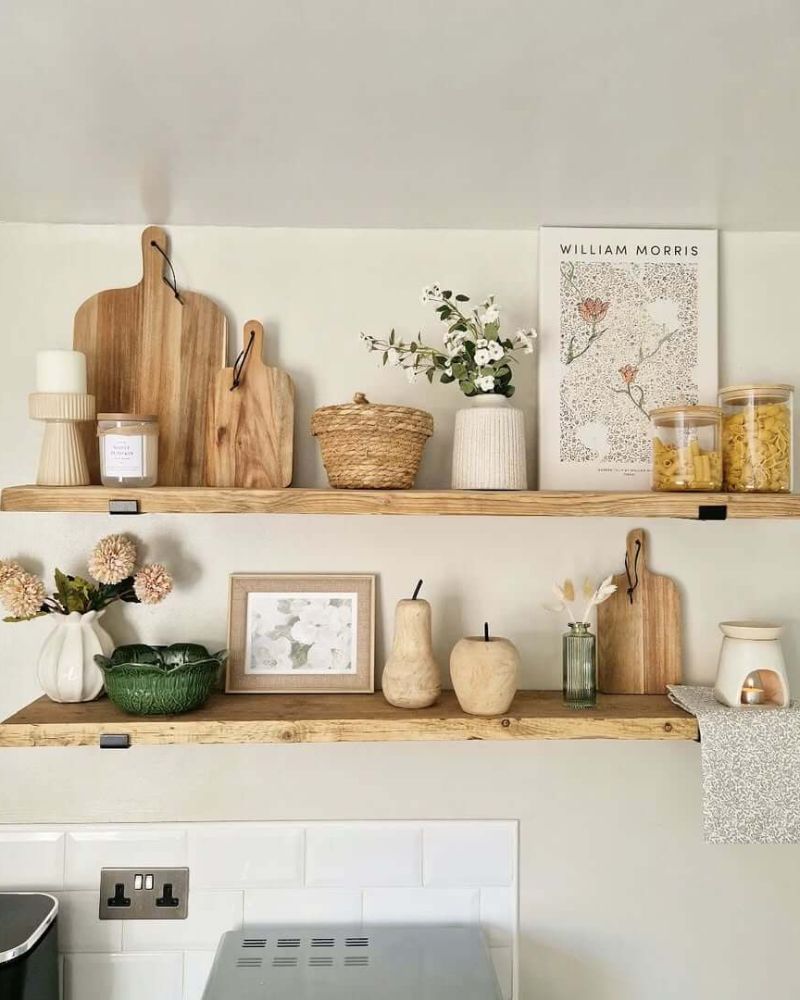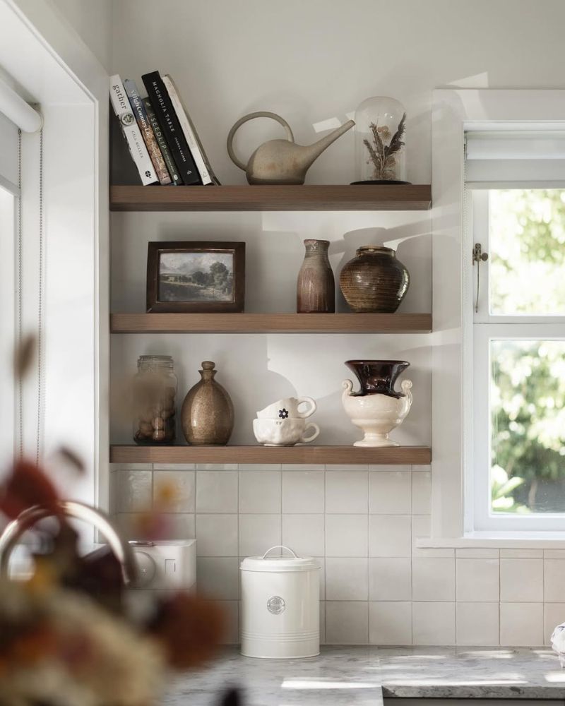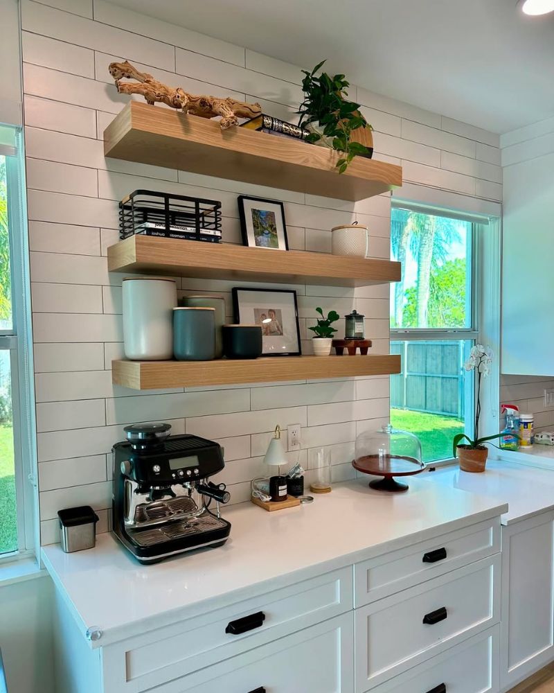 Floating shelves are basically the “cool older sibling” of kitchen storage. They’re airy, they look expensive even when they aren’t, and they force you to actually organize your stuff because, well, everyone can see it.