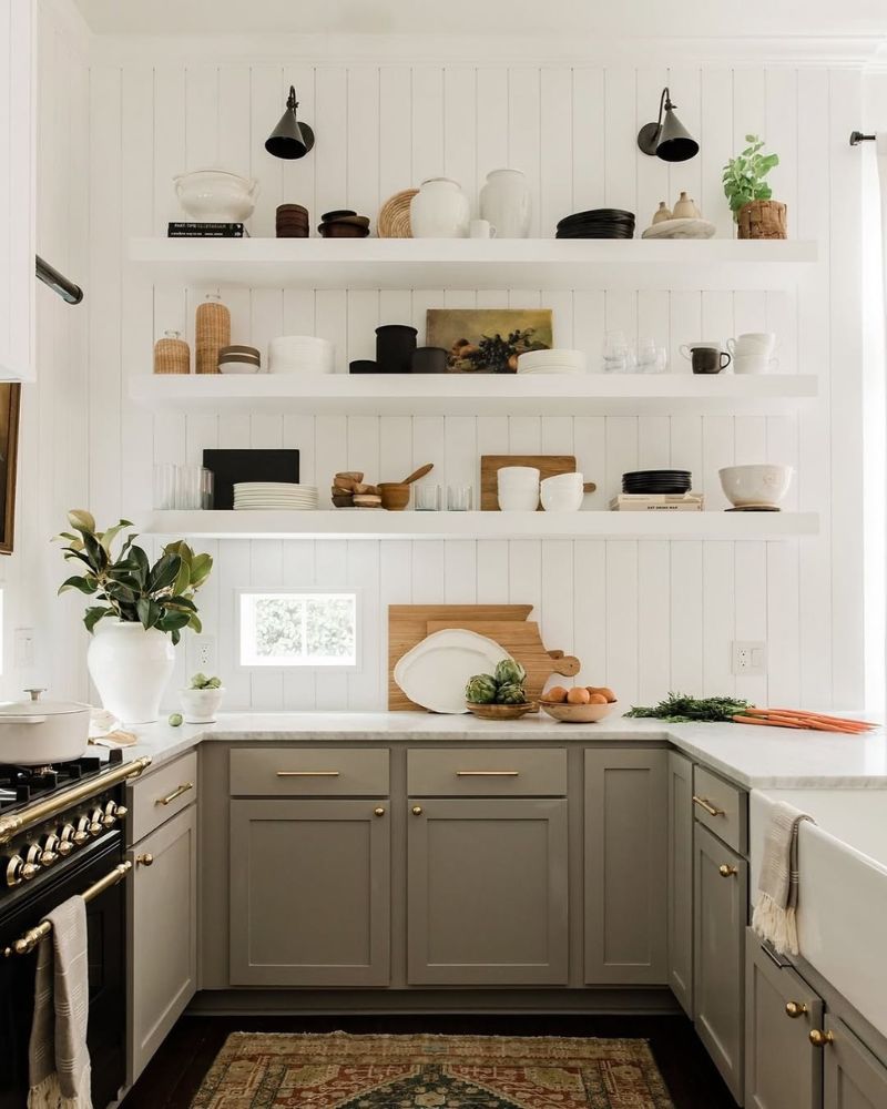 If you hate visual clutter, try painting your shelves the exact same color as your walls. This makes the shelf “disappear,” leaving your items looking like they’re literally hovering in mid-air. It’s a genius hack for tiny kitchens because it keeps the room feeling open and breezy.