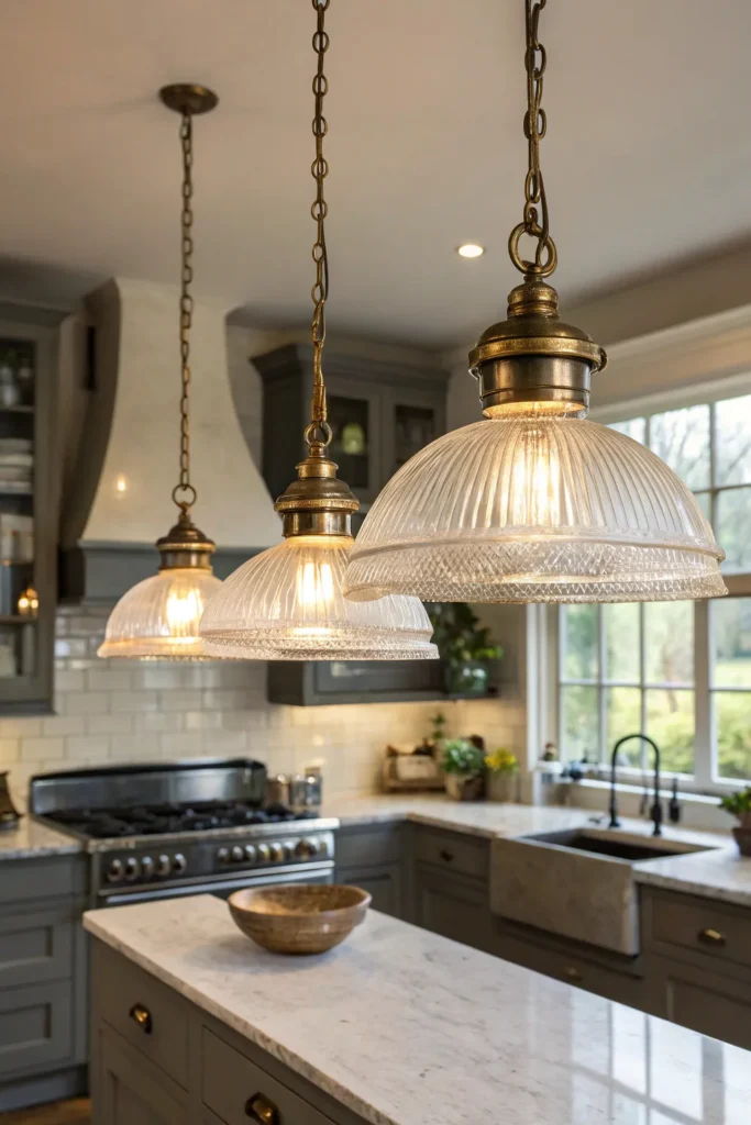 I reach for prismatic glass schoolhouse pendants, mini-library fixtures, and elegant holophane shades that spread light beautifully. Ever craved character without clutter? This is that lane.
