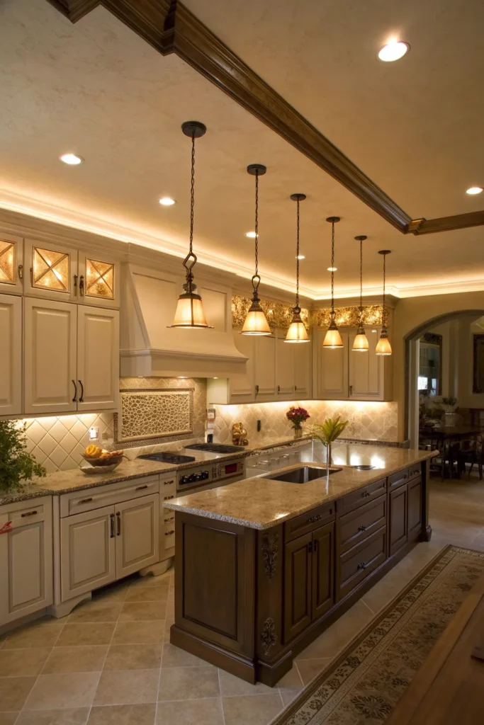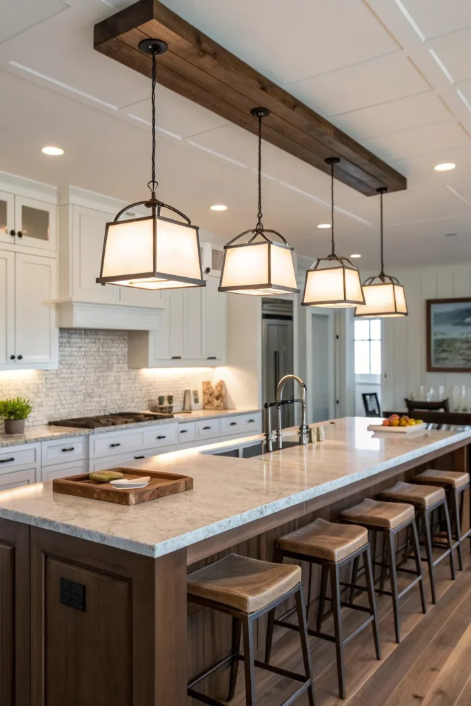 Long islands need rhythm and even light distribution, not a random parade of bulbs. I split the difference between multiple pendants and linear fixtures depending on ceiling height and visual clutter.