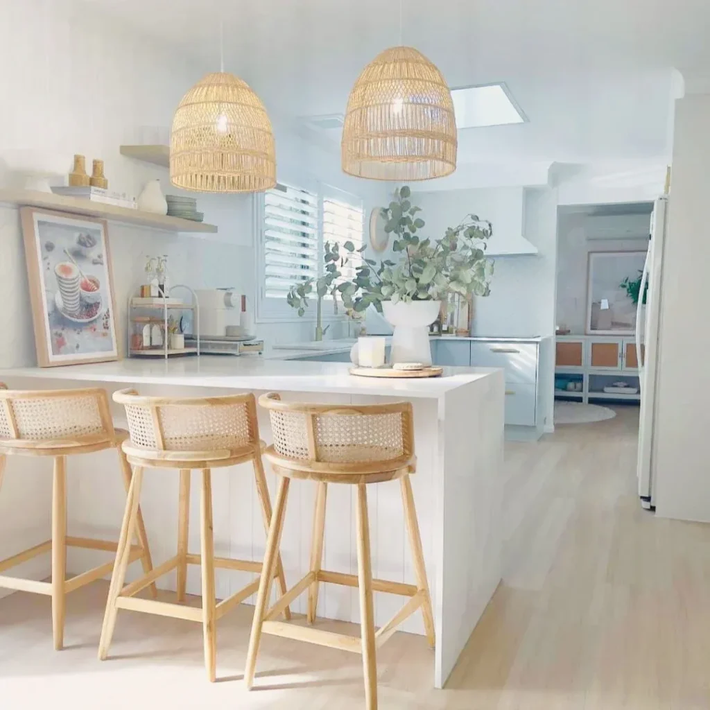 I like the combo of pale fixtures over warm oak stools—clean, calm, and instantly beachy without theme-park energy.