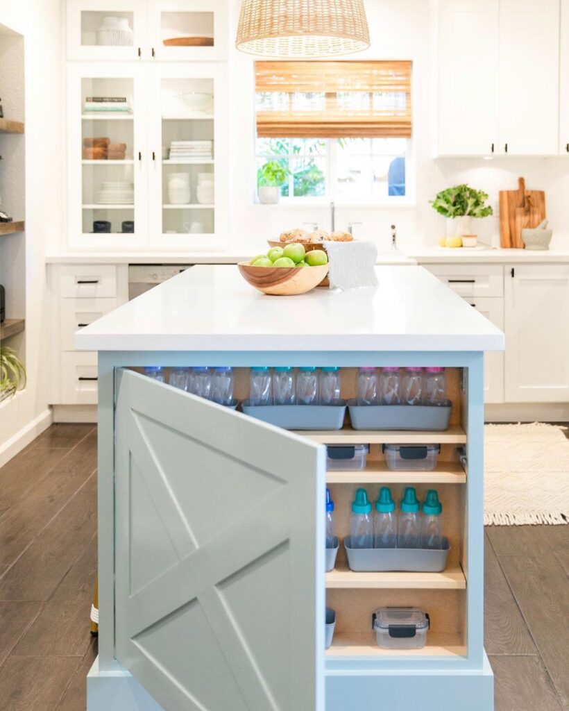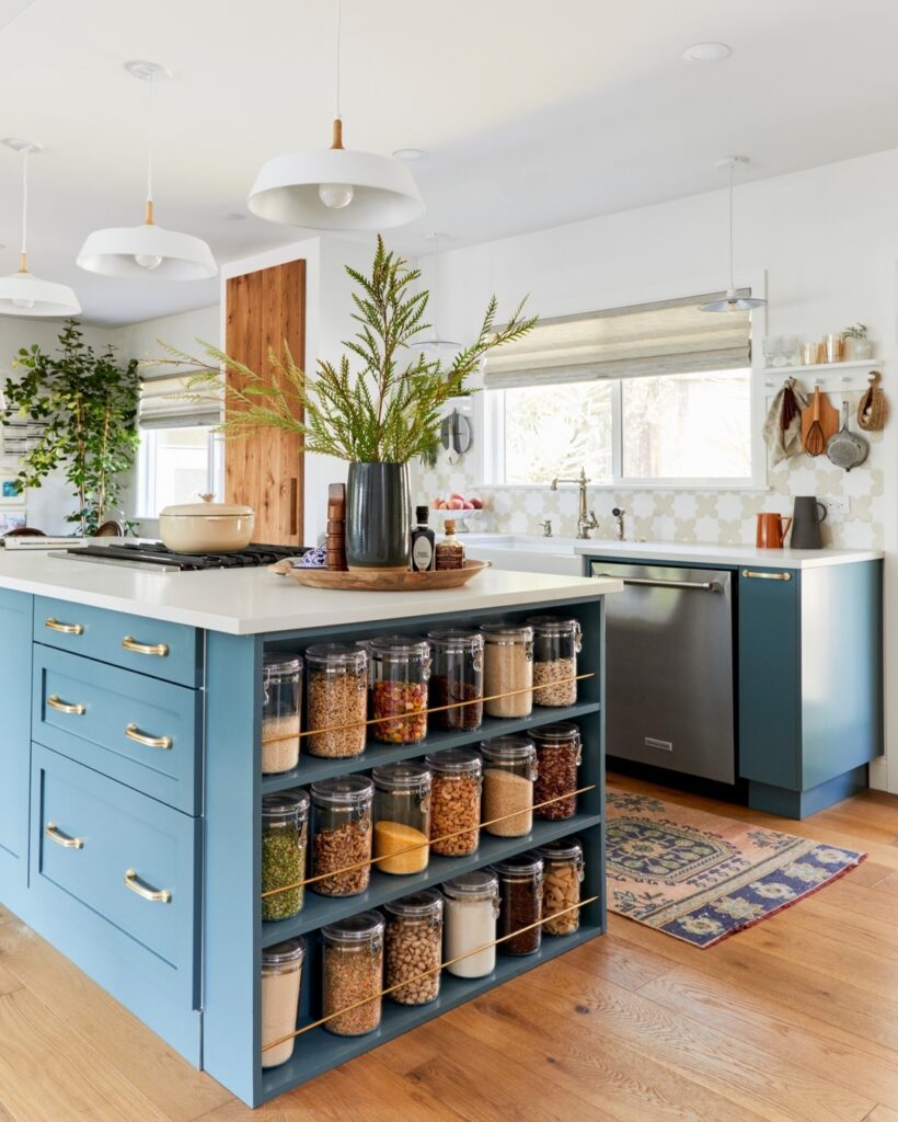 Ditch the messy pantry and move your staples to the island. Use glass jars with airtight lids to store pasta, rice, and coffee beans on an open side shelf. It looks high-end, and you’ll actually know when you’re low on fusilli. 🙂