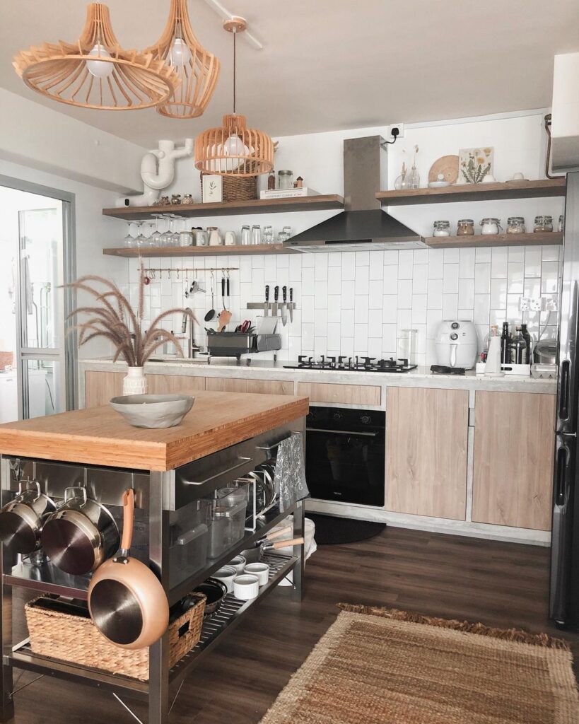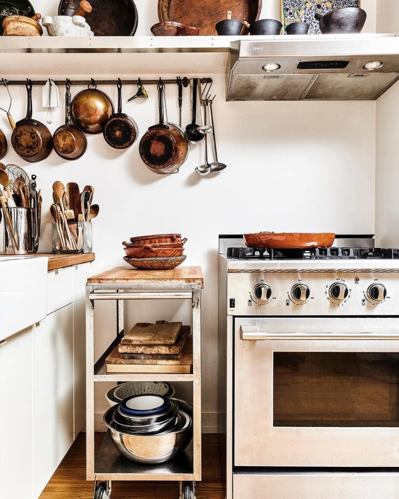 Tiny kitchen? No problem. A rolling wooden cart acts as a “mini island.” You get extra prep space when you need it, and you can shove it into a corner when you don’t. It’s basically the Swiss Army knife of furniture.