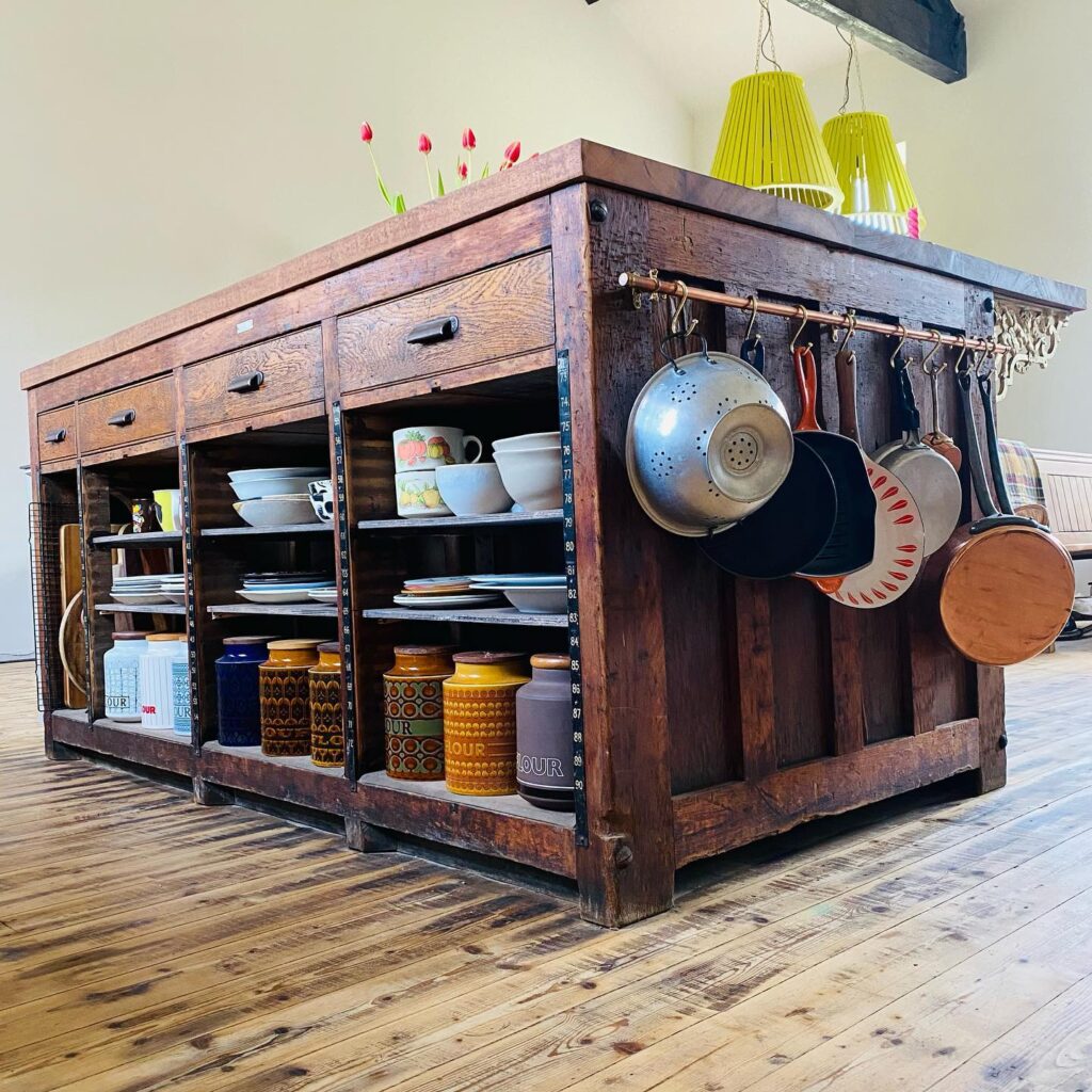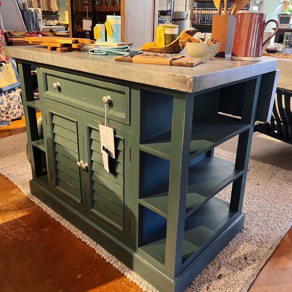 If your kitchen feels cramped, go for an island with glass shelves and doors. It feels lighter than a solid block of wood and lets you show off your fancy wine glasses or vintage vases.
