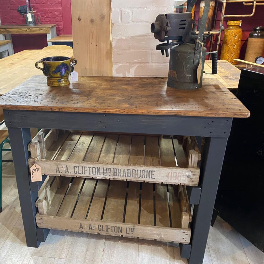Use an island with slatted shelves. The slats are perfect for holding wine bottles steady on top, while the solid bottom shelf handles your heavy Dutch ovens.