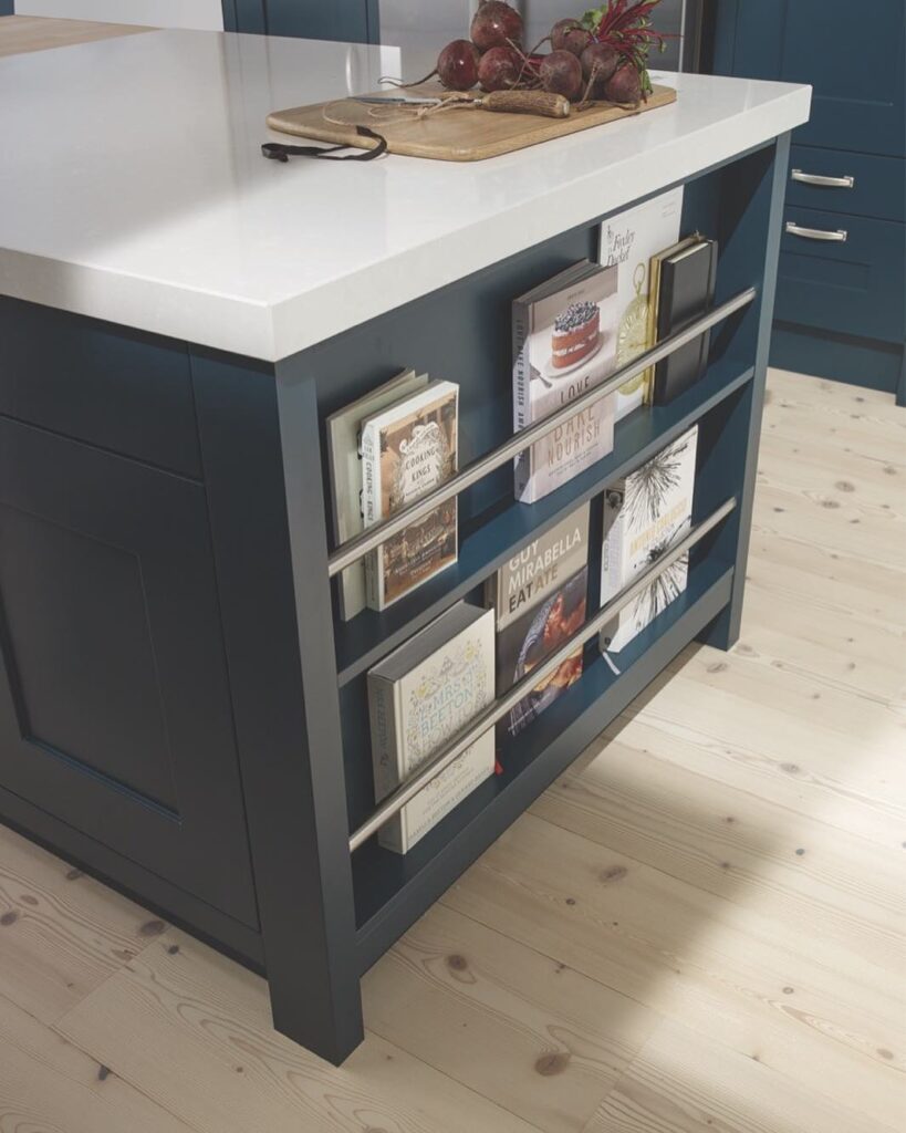 Even a tiny island has room for this. A slim, 6-inch deep shelf on the side is all you need to house your most-used recipe books.