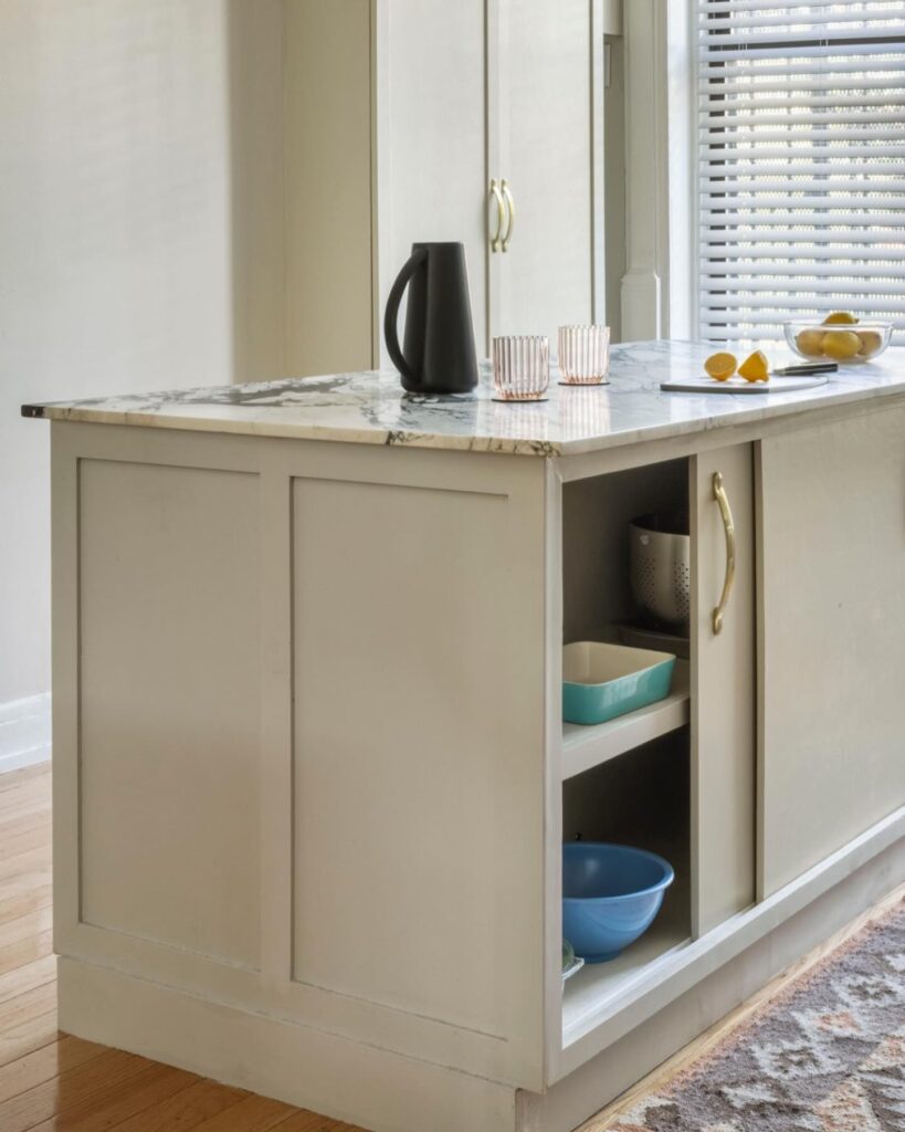 If you cook every single day, don’t hide your most-used pots. An open shelf on the end of the island makes grabbing the pasta pot a five-second task.