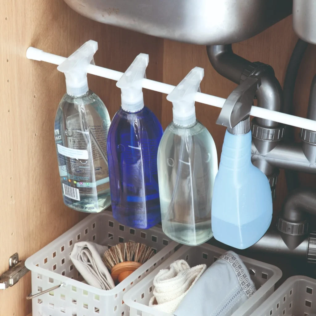 This one feels like a secret life hack that needs to be shared with the world. Install a small tension rod across the top portion of your cabinet, from front to back. Why? So you can hang your spray bottles by their trigger handles!​