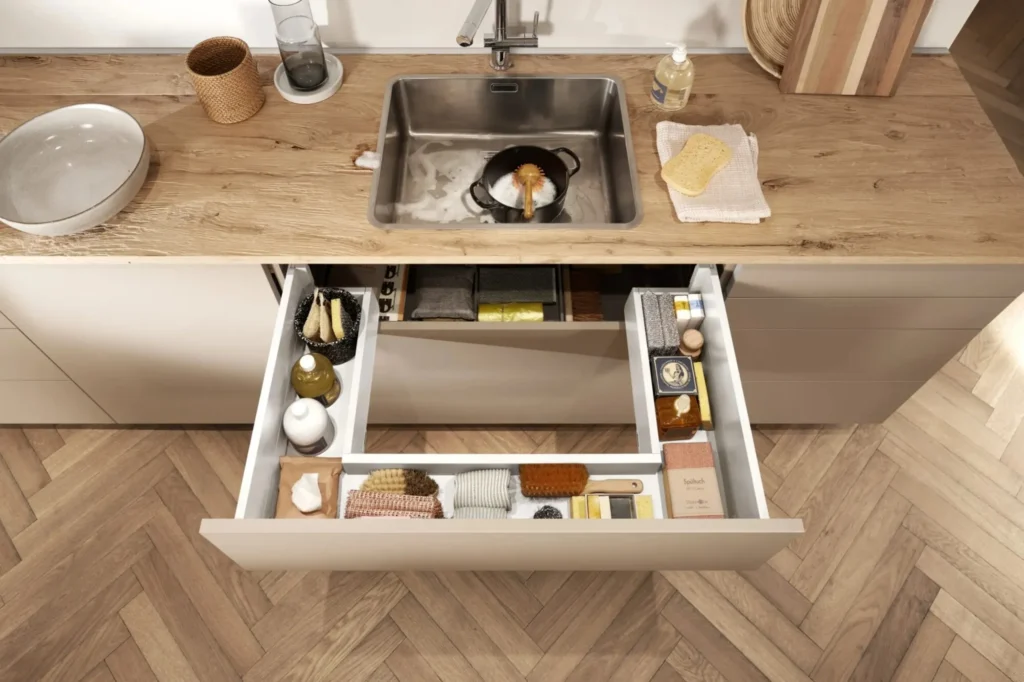 We talked about U-shaped pull-out organizers, but you can also get custom U-shaped drawers built right in. These are designed to wrap perfectly around the sink’s plumbing, transforming what is usually the most awkward, unusable area into a sleek and functional drawer.​