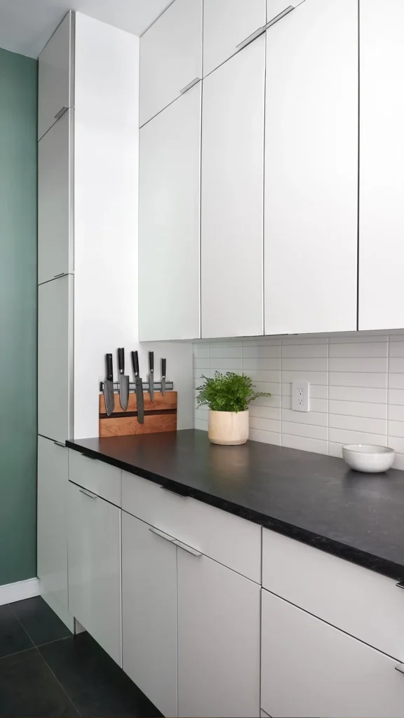 - Lighting: Ensure you have good under-cabinet lighting, or the dark tile might create a “black hole” effect in the corners.