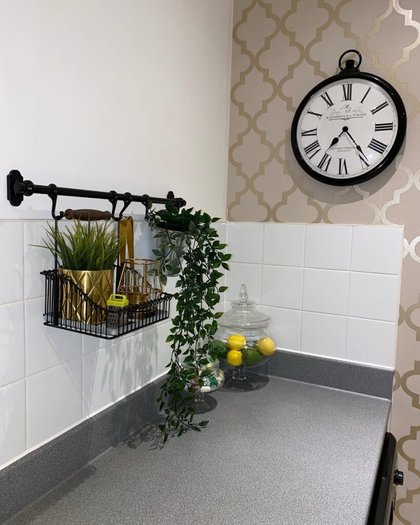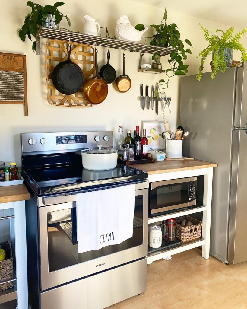 Pans are heavy and bulky. Instead of stacking them into a metal mountain in your lower cabinets, hang them up. It gives off major “professional chef” vibes, even if you’re just heating up ramen. 🙂