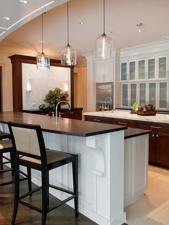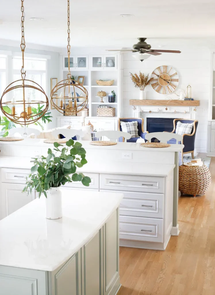 A Modern Coastal Kitchen uses layered lighting with relaxed silhouettes—woven pendants, clear glass domes, and soft brass or matte black finishes. Mix ambient, task, and accent lighting to keep evenings warm and inviting without harsh glare. Woven shades dim the bulbs naturally while adding texture overhead—win-win.​