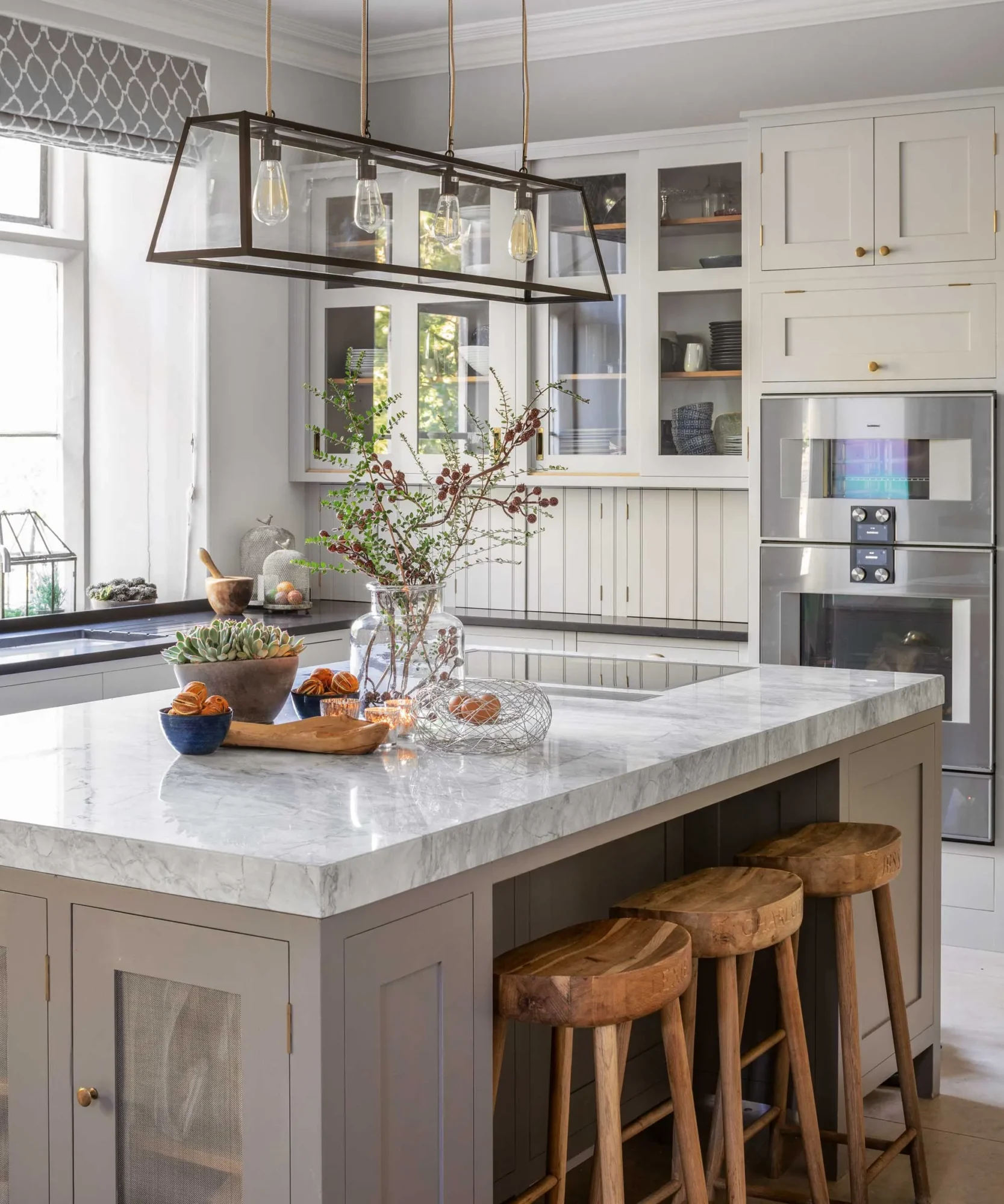 • Try rattan pendants over the island, cane-backed stools, or a sisal runner with a low pile for durability.​
