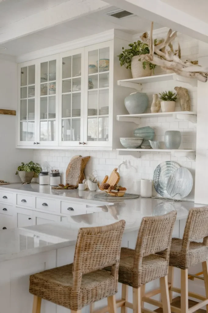 A Modern Coastal Kitchen uses a bit of open shelving to showcase ceramics, glass, and wood—kept tight and edited so it reads gallery, not yard sale. Limit shelves to one wall or a small section to keep maintenance reasonable. Display pale stoneware, clear glass, and a touch of greenery for a soft, coastal vignette.​