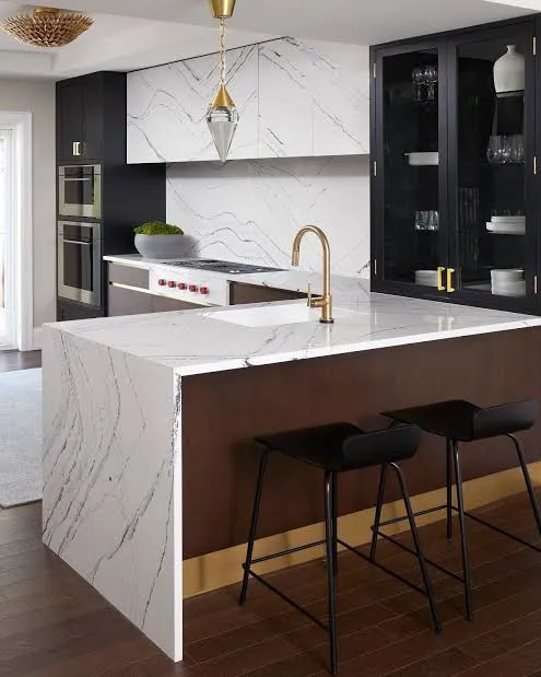 If you want to elevate your kitchen from “nice” to “magazine-worthy,” look at the waterfall edge. This is where the countertop material doesn’t just stop at the edge of the island; it turns a 90-degree angle and flows all the way to the floor.