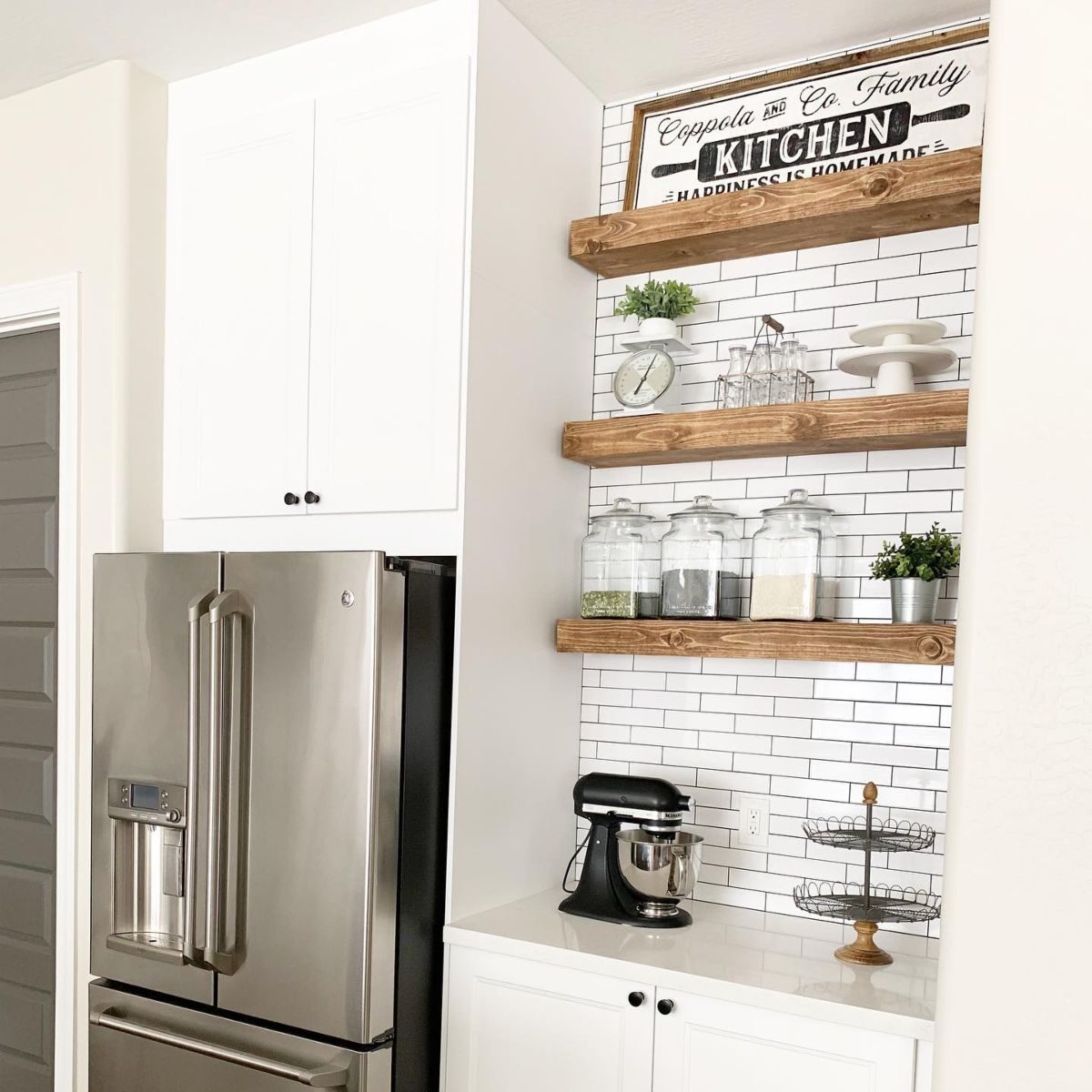 For a high-end, custom look, match your shelf material exactly to your walls or cabinets. This creates a “seamless” transition that makes your kitchen feel twice as big.