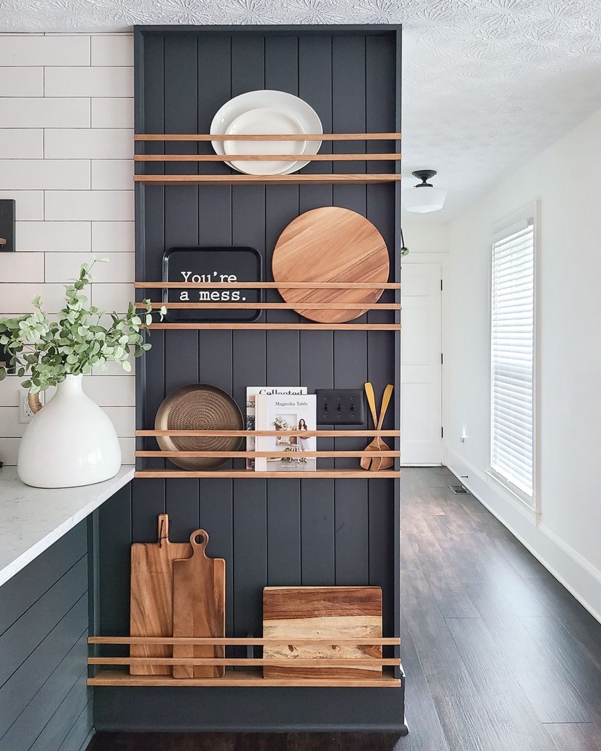 If you’re into the Fixer-Upper look, go for chunky wooden shelves with a bit of distress. They’re perfect for displaying white ceramic pitchers or dried floral arrangements.