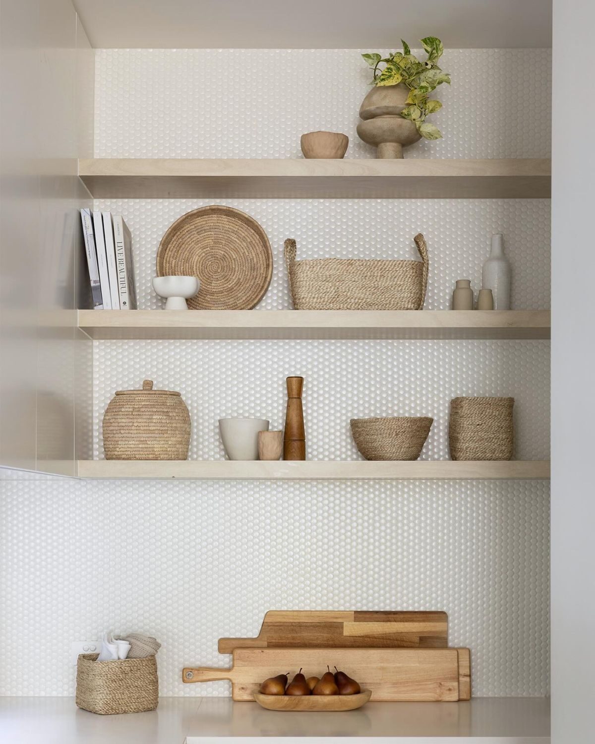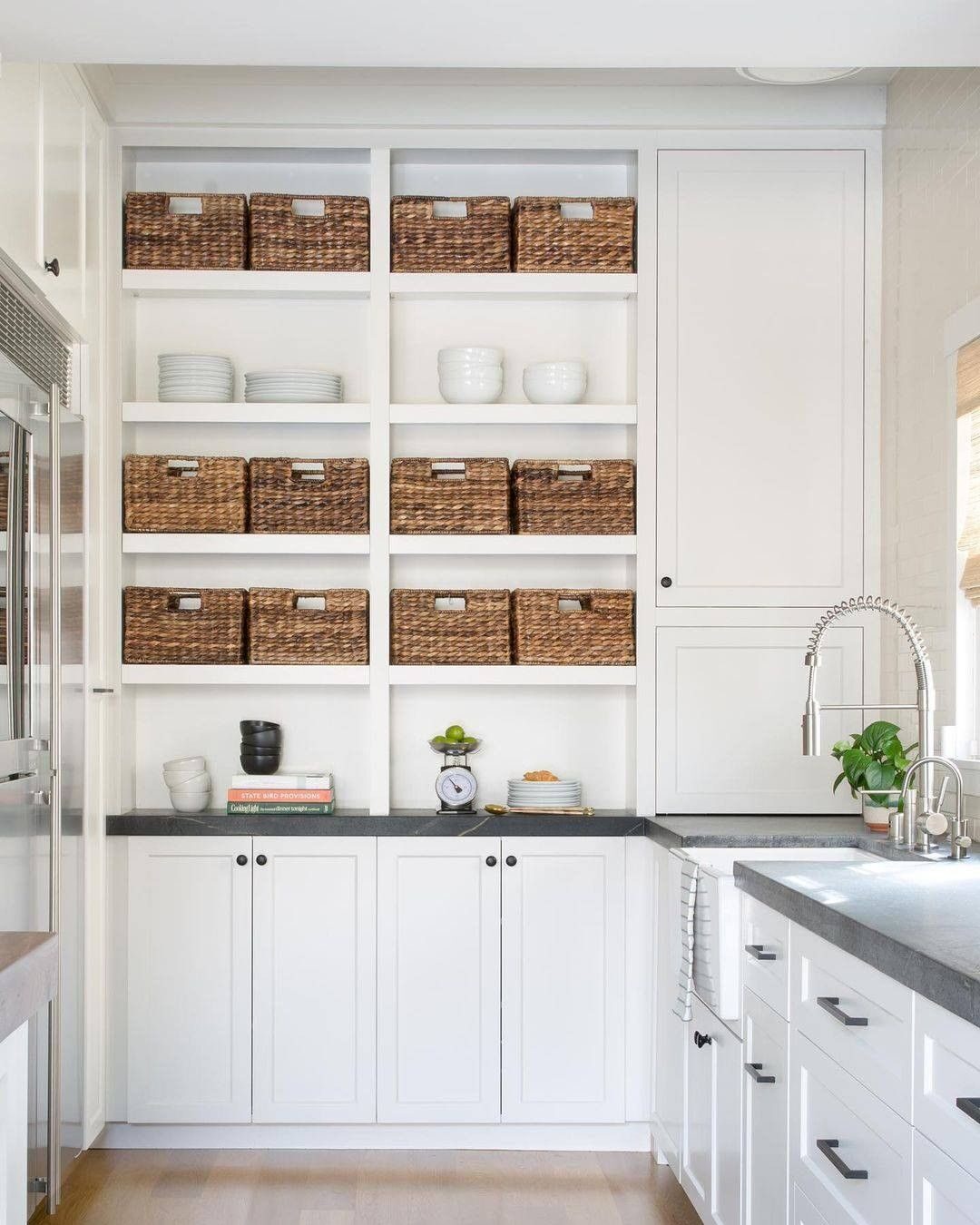 Let’s be honest: not everything in your kitchen is pretty. For the mismatched snack bags or bulky items, toss them into woven baskets. It hides the mess but keeps the “organic” look of open shelving alive.