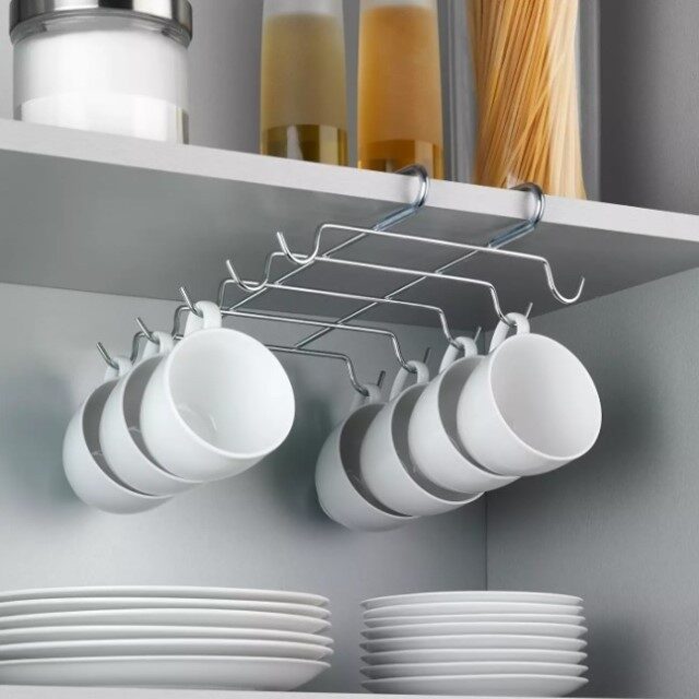 If your shelves are full, look up. A simple hanging rack under a shelf turns your mug collection into a piece of art and frees up space for plates below.