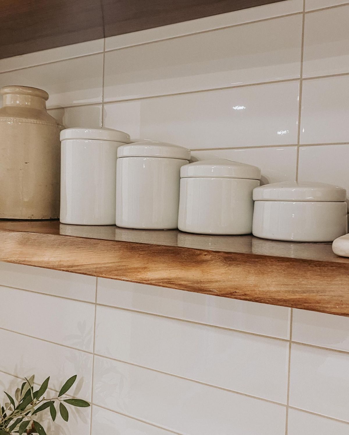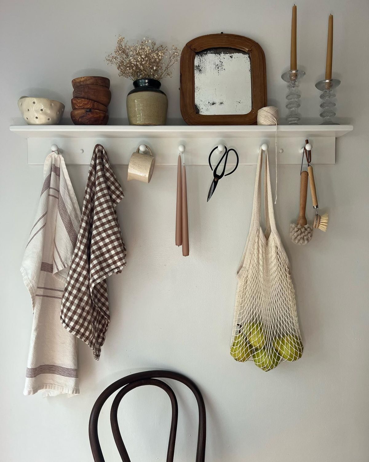 You don’t need a full renovation to get open storage. A peg rail shelf is a low-effort, high-reward addition. Hang your tea towels or measuring cups from the pegs and put your oils on the shelf above. Easy.