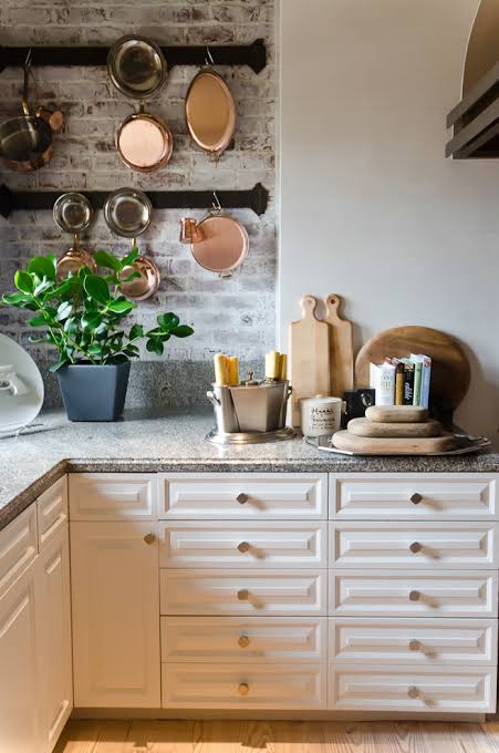 • Hook it up: Add a few brass hooks for tea towels or oven mitts.