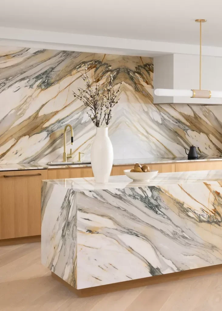 It gives a very earthy, organic, “cave-chic” feel. It contrasts beautifully with sleek, modern cabinets. If you have high-gloss flat-front cabinets, a split-face stone backsplash prevents the room from looking like a spaceship.
