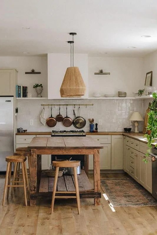 - Accents: Terracotta pots, wooden cutting boards, and woven light fixtures.