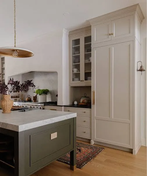 Taupe is the sophisticated older sister of beige. It has purple or pink undertones that make it feel luxurious and warm. When you pair taupe cabinetry with unlacquered brass hardware, you get a kitchen that looks distinctly European.