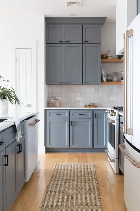 Style Tip: Add a vintage runner rug with reds and faded blues. The taupe cabinets provide the perfect quiet background for a patterned rug to shine.