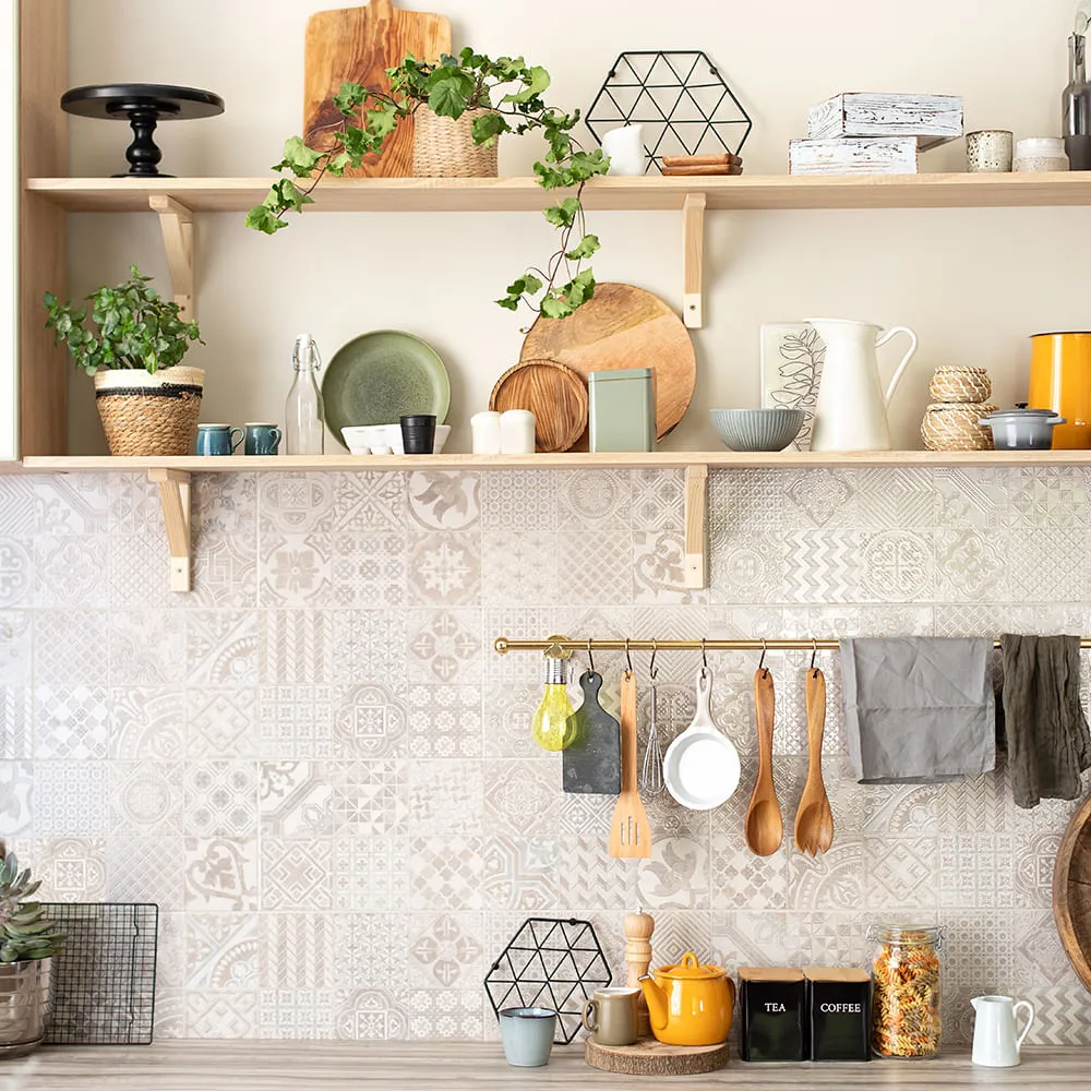 - Consider tile: In a kitchen, continuing your backsplash tile up behind the shelves creates a seamless, high-end, and custom look.