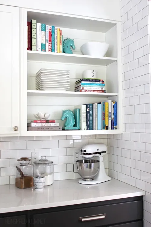 Let’s be honest, cookbooks in the kitchen often double as decor. Instead of just lining them up library-style, use them as styling tools.