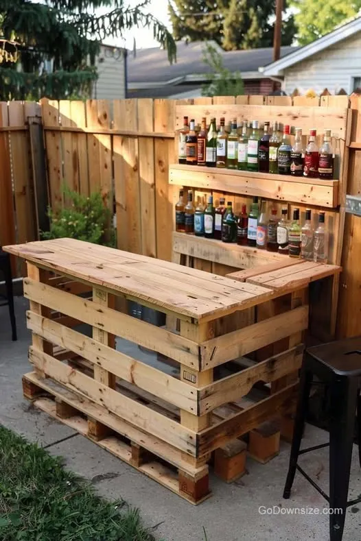 Transform your backyard into an entertainment hub by building a bar from pallets. Assemble them in a U-shape or L-shape, secure with screws, and add a smooth countertop. Install shelves or hooks for glasses and bar tools, then personalize with paint or stain to match your outdoor décor.