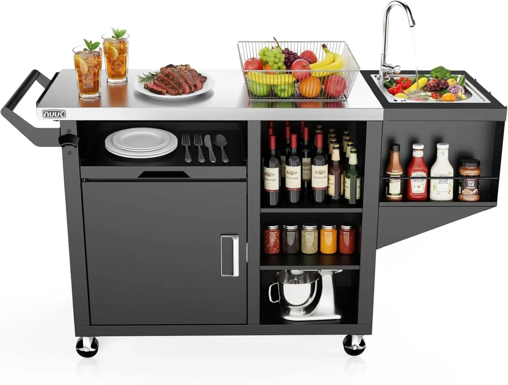 Add flexibility to your outdoor kitchen with a movable island that provides extra counter space for food preparation. Look for models with wheels for easy mobility and features like built-in storage or towel racks. Check flea markets or online sales for budget-friendly options.