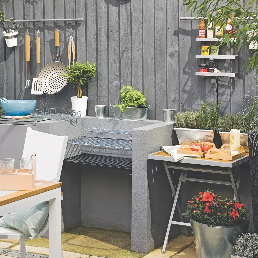 Maximize your outdoor kitchen space by utilizing vertical storage options. Install a pegboard or sturdy hooks on a nearby wall to hang utensils, pots, and pans, keeping everything organized and within reach while freeing up valuable counter space.
