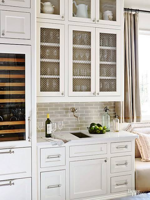 If you want something edgier than glass but less “heavy” than solid wood, metal wire mesh inserts are your best friend. They offer a peek-a-boo effect that hides the exact brand of your crackers while showing off the silhouettes of your bowls. It’s a very “industrial bistro” vibe that feels expensive without trying too hard.